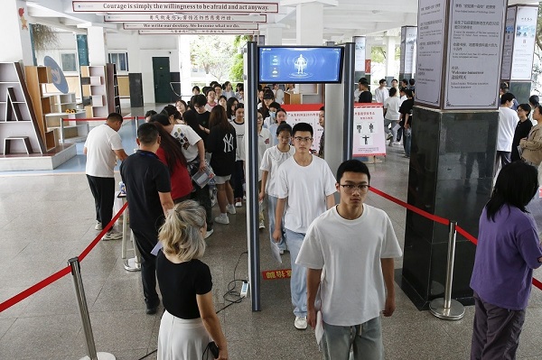 考生们陆续来到考点,在考场外按监考员要求,出示身份证、准考证,通过“金属探测器”和“人脸识别仪”安全检查后,进入考场找到自己的座位。