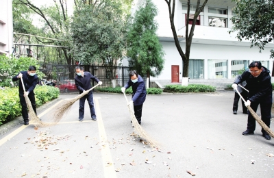 王菲在市委大院内带头参加爱国卫生运动“周末卫生大扫除”活动。
