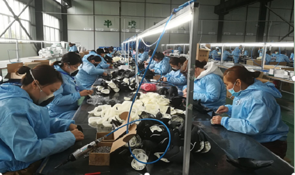 在繁忙的口罩生产车间,2条口罩生产线高速运转,工人们穿着防护服、戴着防护口罩,忙着手中的细活。硅胶、ABS塑料、滤纸等原料通过压模、穿线、灭菌、包装、封口等工序,在原材料充足的情况下,目前每天可以生产5千多个口罩。