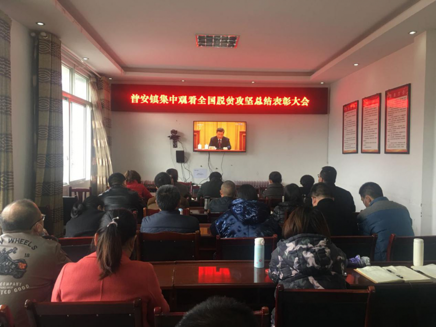 普安镇政府会议室里,乡镇干部们在观看全国脱贫攻坚总结表彰大会时格外自豪。