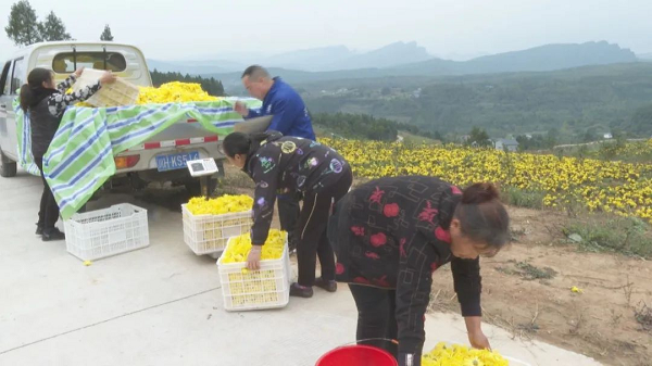 满地金蕊遍地黄,秋风瑟瑟菊花香。走进下寺镇二龙园区金丝皇菊种植基地里,香气四溢,放眼望去,金灿灿的金丝菊竞相绽放、摇曳生姿,点亮了深秋山间,美妙至极。基地负责人正组织当地群众采摘、搬运、装车。