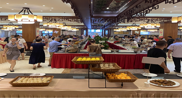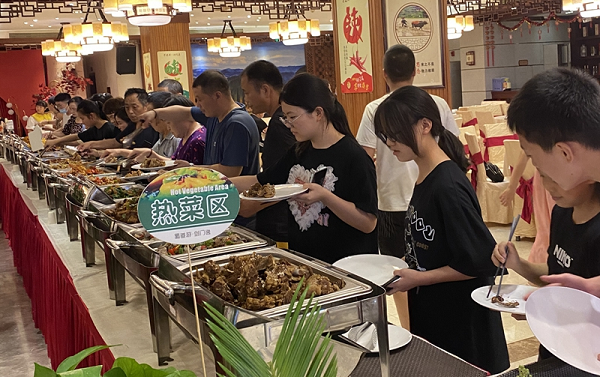 7月11日晚上7点,在剑阁县剑门逸酒店第三届美食节活动现场,人头攒动、热闹非凡。厨师在大厅现场制作麻辣串,服务员微笑着指引消费者们排队取餐、劝导大家按需拿取,消费者们愉快地交谈、分享着各色美食,融汇成了美食节现场浓浓的“烟火气”。