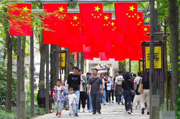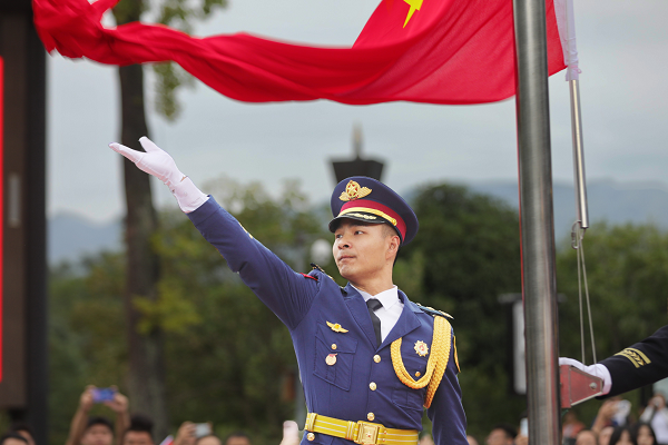 10月1日上午9点,剑门关景区举行升国旗仪式,来自五湖四海的游客们齐聚在一起,共同庆祝中华人民共和国成立74周年。