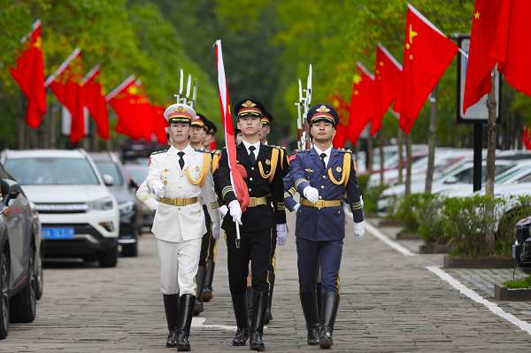 在剑门关景区北门广场,“旗志”团队迈着整齐划一、铿锵有力的步伐,踏着激昂的鼓点,昂首挺胸地护卫着五星红旗走上旗台。