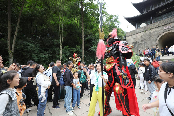 剑门蜀道剑门关景区以“江山庆华诞 国庆游剑门”为主题,推出“国旗耀剑门、诗说剑门、印在剑门”等九大文化体验活动。游客在游览剑门雄关的同时,欣赏开关仪式、国风舞蹈和特色非遗展演,与国风三国人物机甲、李白、陆游等NPC互动,打卡翠云廊和古蜀道参与古柏保护行动,赢取“蜀道古柏保护公益行动勋章”。